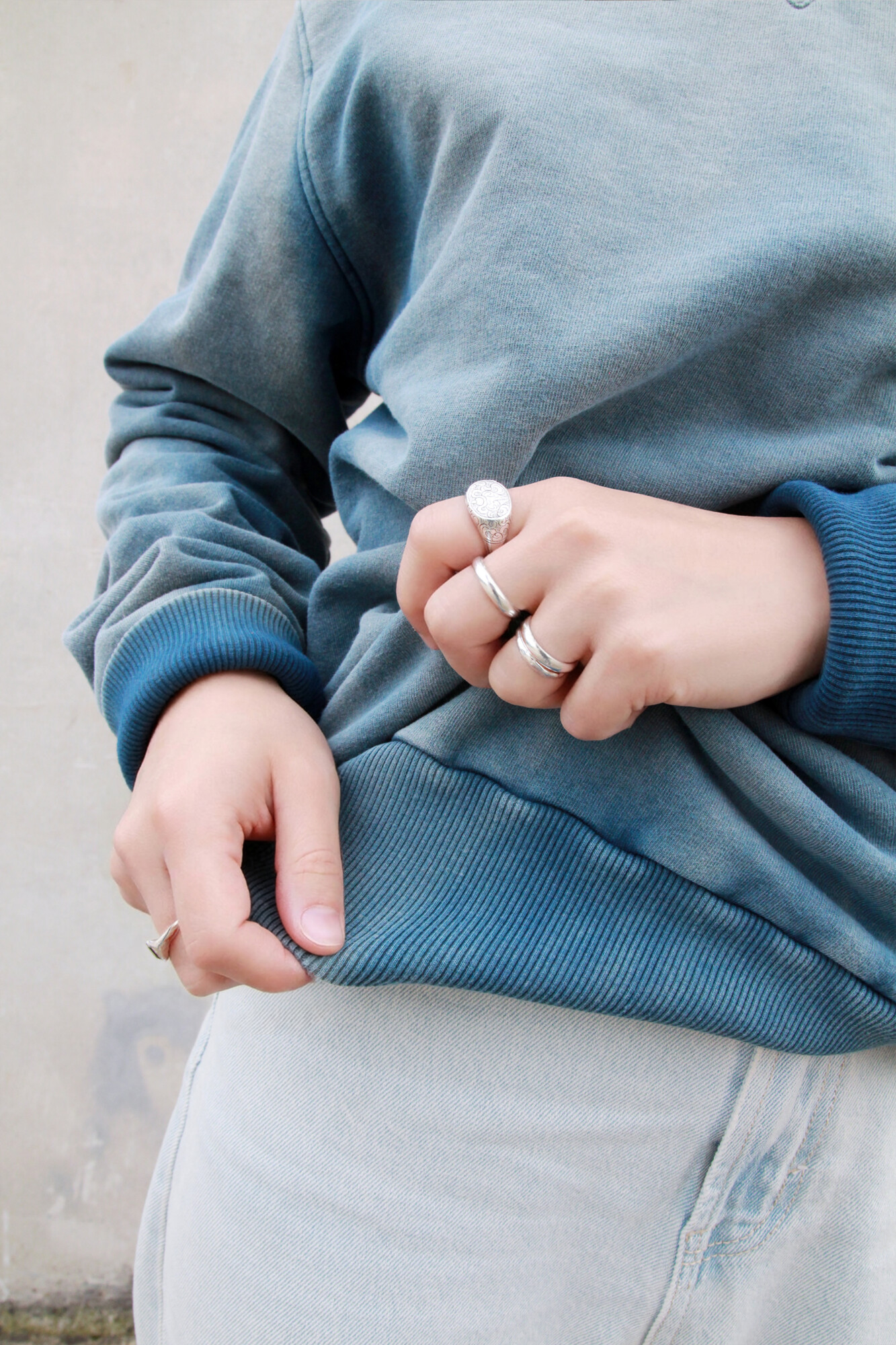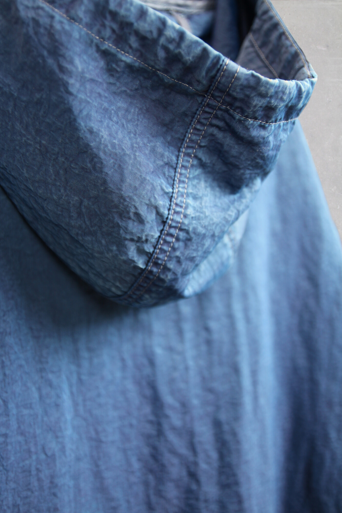 A prima vista richiama l’estetica del denim vissuto: superfici sbiadite, pieghe naturali, baffi, abrasioni, segni che evocano il passare del tempo. Ogni dettaglio parla un linguaggio familiare. Ma basta avvicinarsi, sfiorare il capo, e la percezione cambia. Si apre una nuova lettura.
